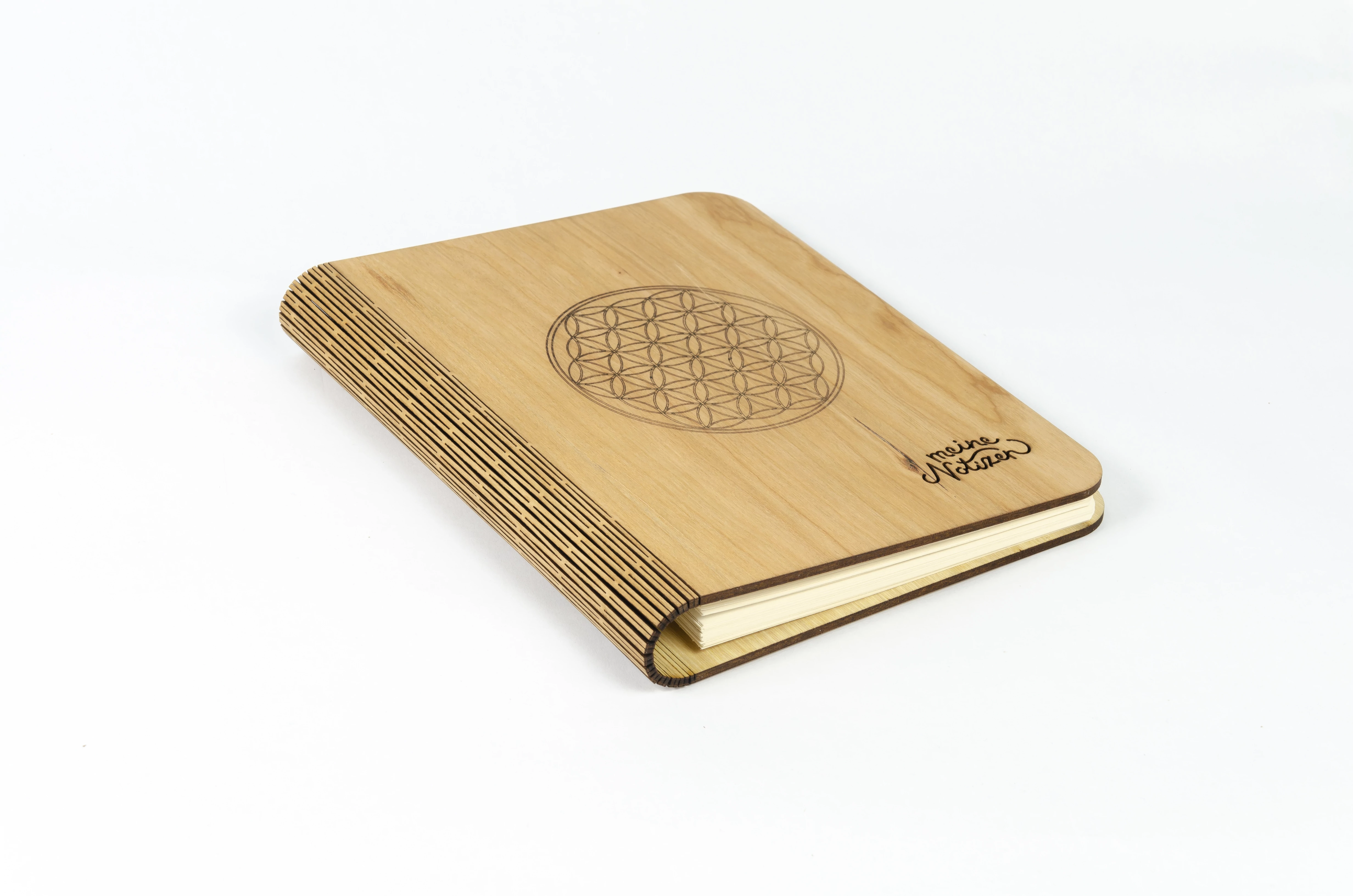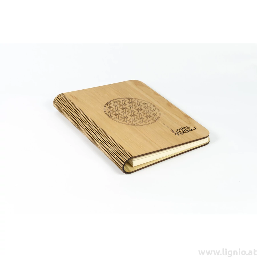 Notizbuch aus Kirschholzfunier mit besonderen Lasercut an den Umschlag und auch an den Buchrücken was innen eine extra Befestigung hat. Das Holz ist mit natürlichem Öl veredelt. Die wechselbare füllung ist 80 g/m² FSC-zertifizierten Recyclingpapier in hochweiß. Echte Handarbeit. Maße: 22x17,7x3 cm, 3 Stück/Packung