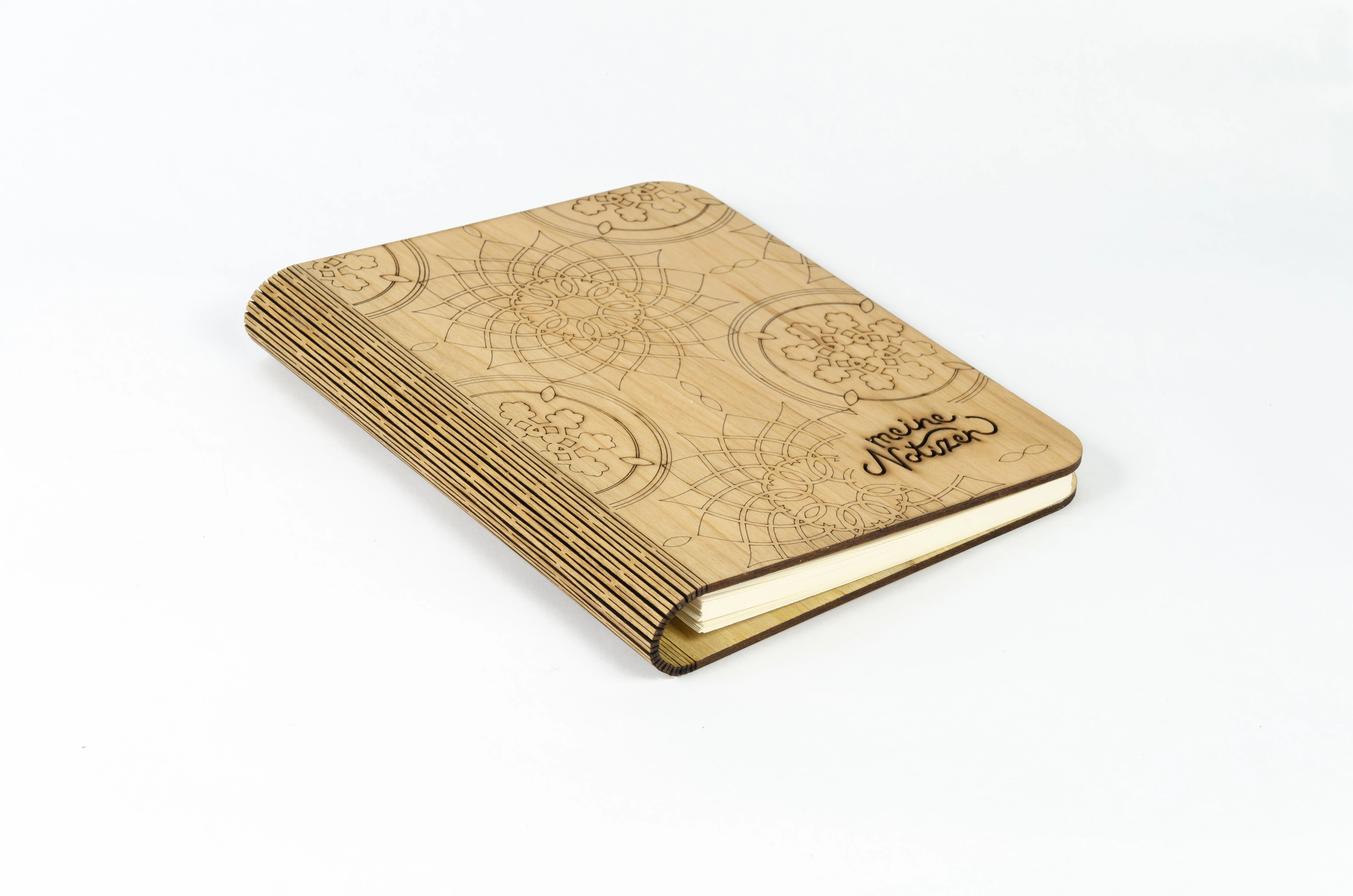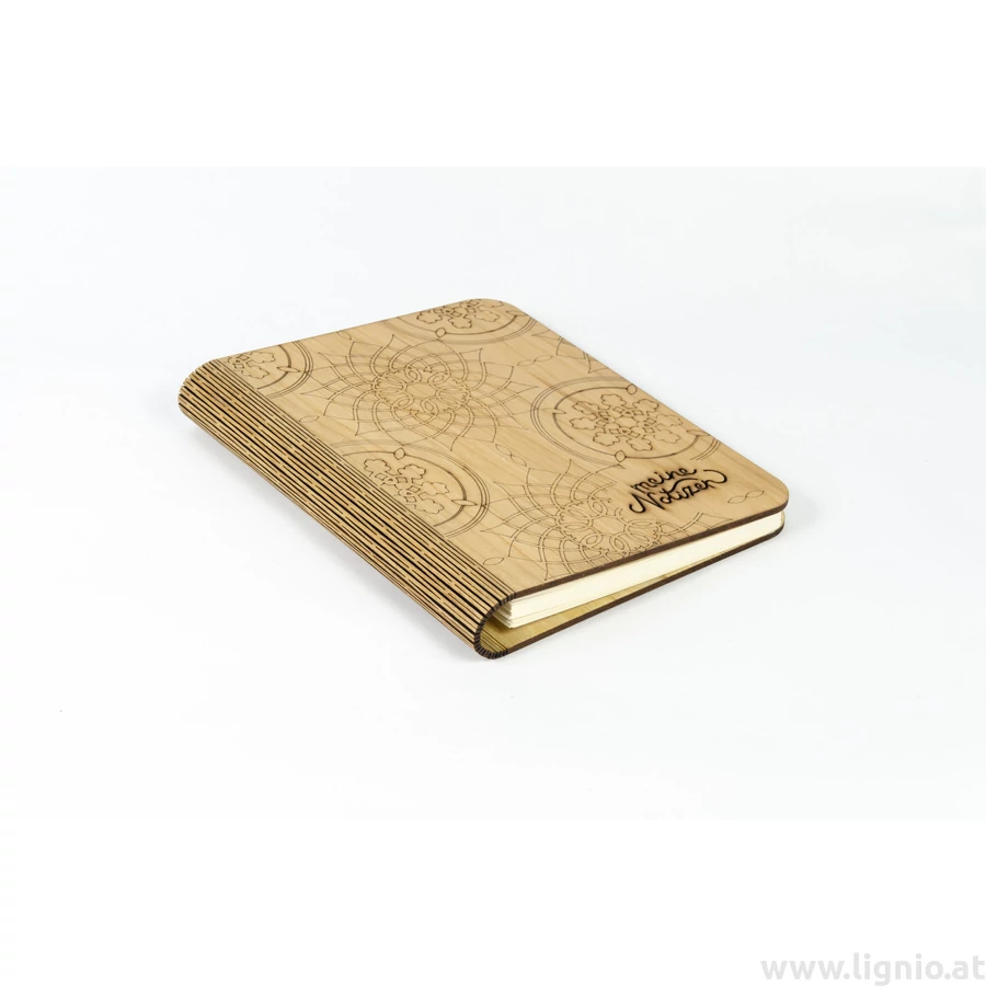 Notizbuch aus Kirschholzfunier mit besonderen Lasercut an den Umschlag und auch an den Buchrücken was innen eine extra Befestigung hat. Das Holz ist mit natürlichem Öl veredelt. Die wechselbare füllung ist 80 g/m² FSC-zertifizierten Recyclingpapier in hochweiß. Echte Handarbeit. Maße: 22x17,7x3 cm, 3 Stück/Packung