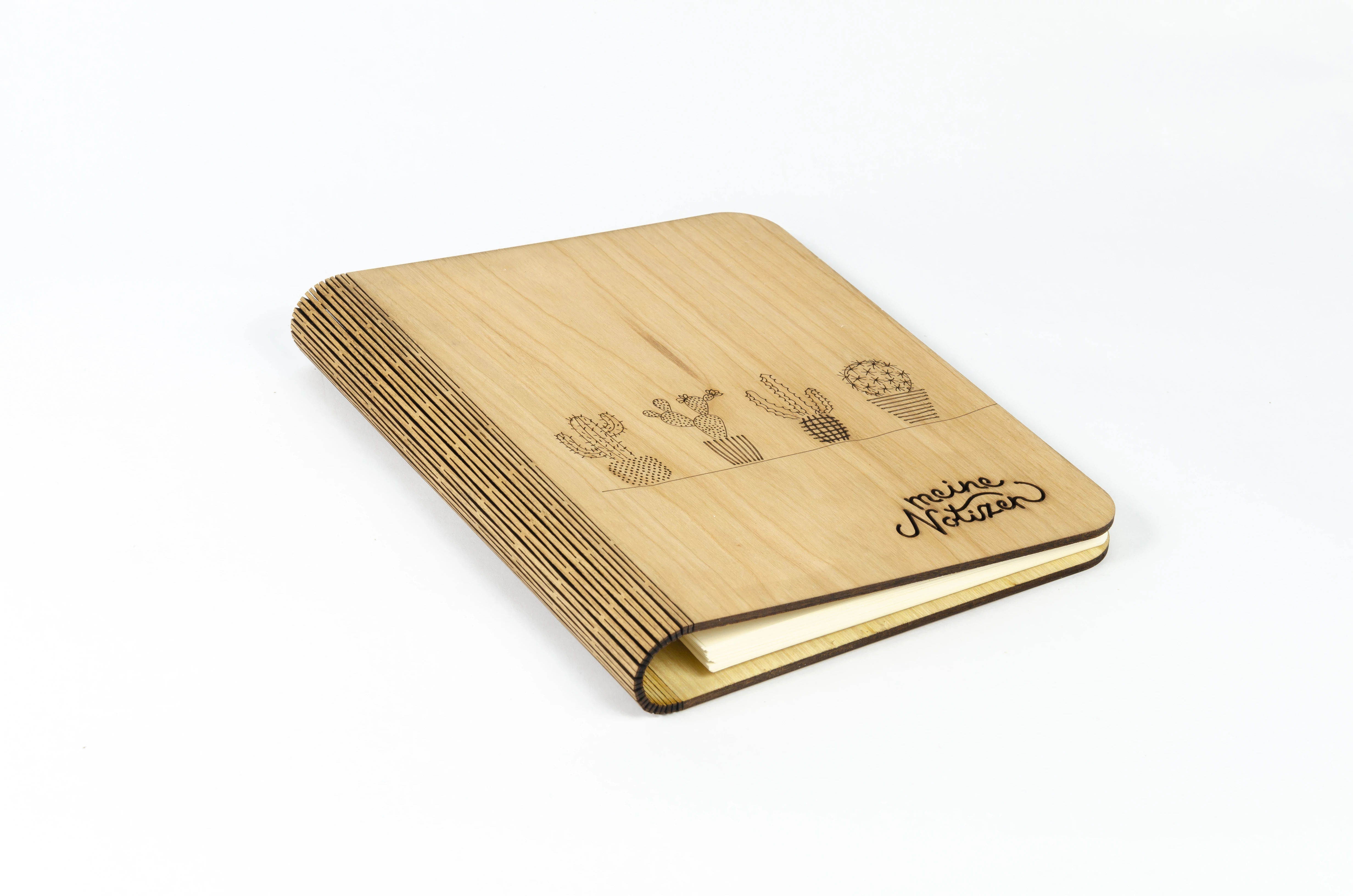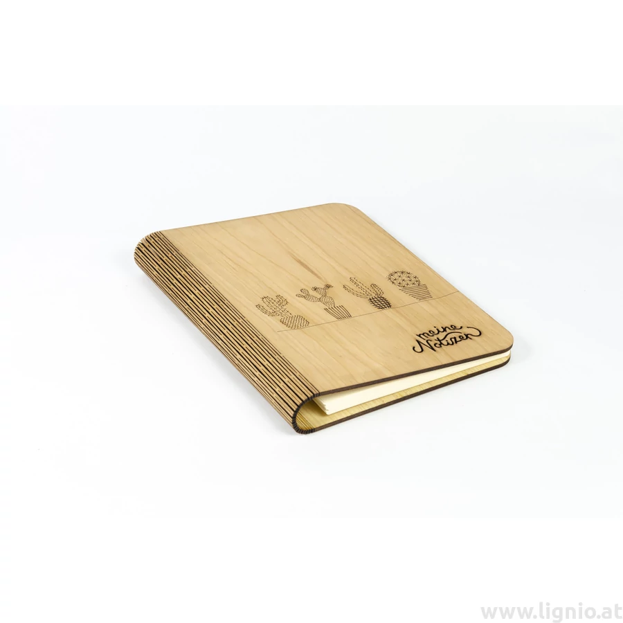 Notizbuch aus Kirschholzfunier mit besonderen Lasercut an den Umschlag und auch an den Buchrücken was innen eine extra Befestigung hat. Das Holz ist mit natürlichem Öl veredelt. Die wechselbare füllung ist 80 g/m² FSC-zertifizierten Recyclingpapier in hochweiß. Echte Handarbeit. Maße: 22x17,7x3 cm, 3 Stück/Packung