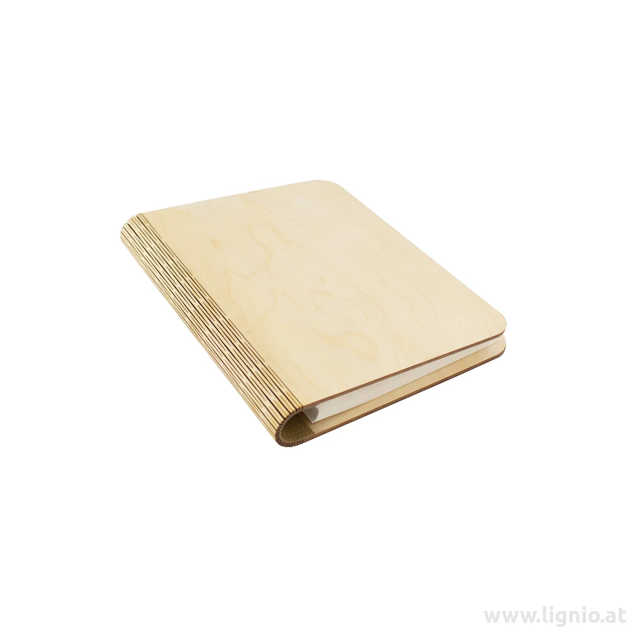 Notizbuch aus Birkenholzfunier mit besonderen Lasercut an den Umschlag und auch an den Buchrücken was innen eine extra Befestigung hat. Das Holz ist mit natürlichem Öl veredelt. Die wechselbare füllung ist 80 g/m² FSC-zertifizierten Recyclingpapier in hochweiß. Echte Handarbeit. Maße: 22x17,7x3 cm, 3 Stück/Packung