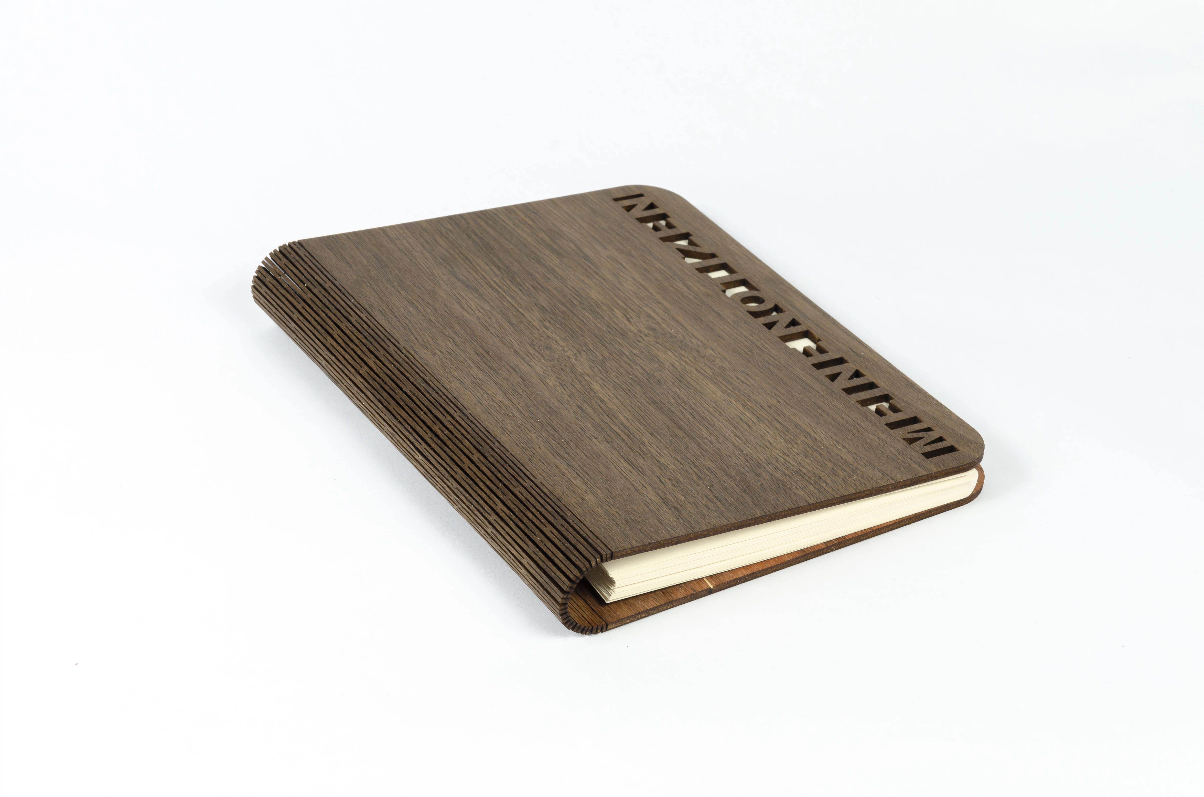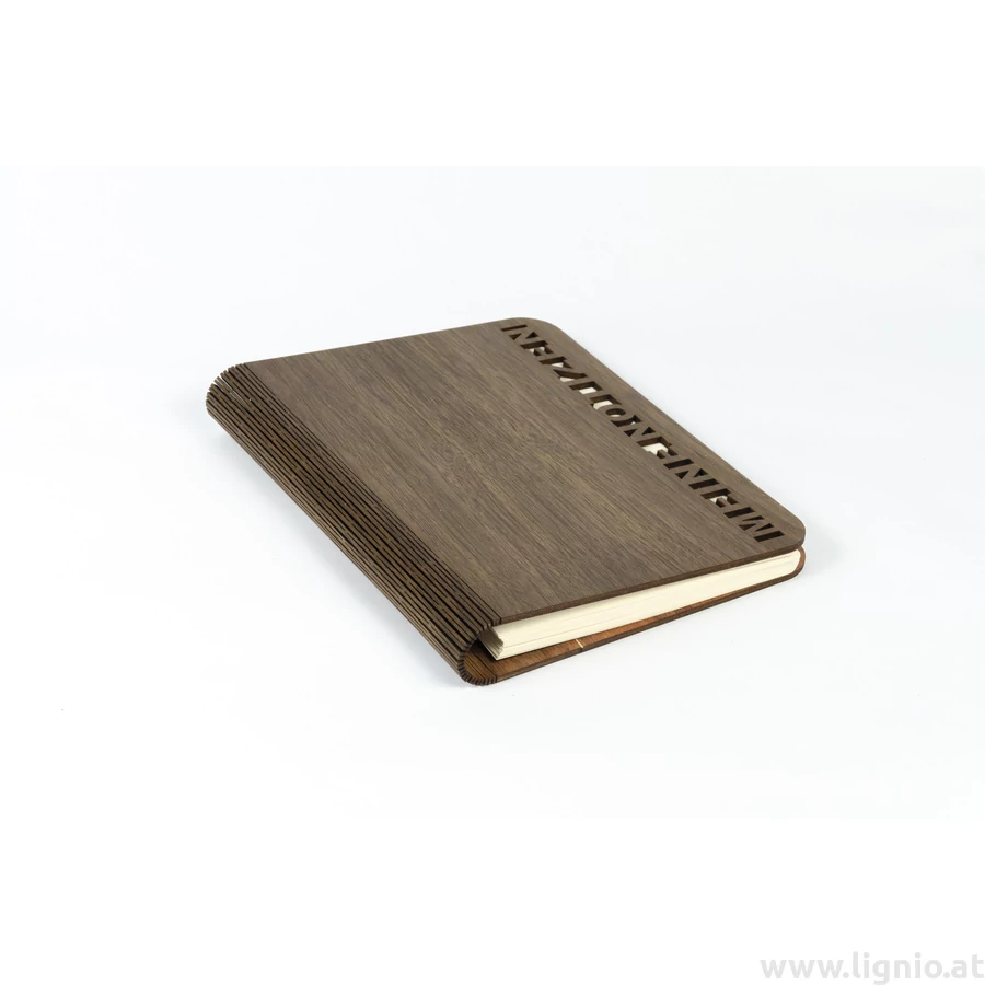 Notizbuch aus Nussholzfunier mit besonderen Lasercut an den Umschlag und auch an den Buchrücken was innen eine extra Befestigung hat. Das Holz ist mit natürlichem Öl veredelt. Die wechselbare füllung ist 80 g/m² FSC-zertifizierten Recyclingpapier in hochweiß. Echte Handarbeit. Maße: 22x17,7x3 cm, 3 Stück/Packung