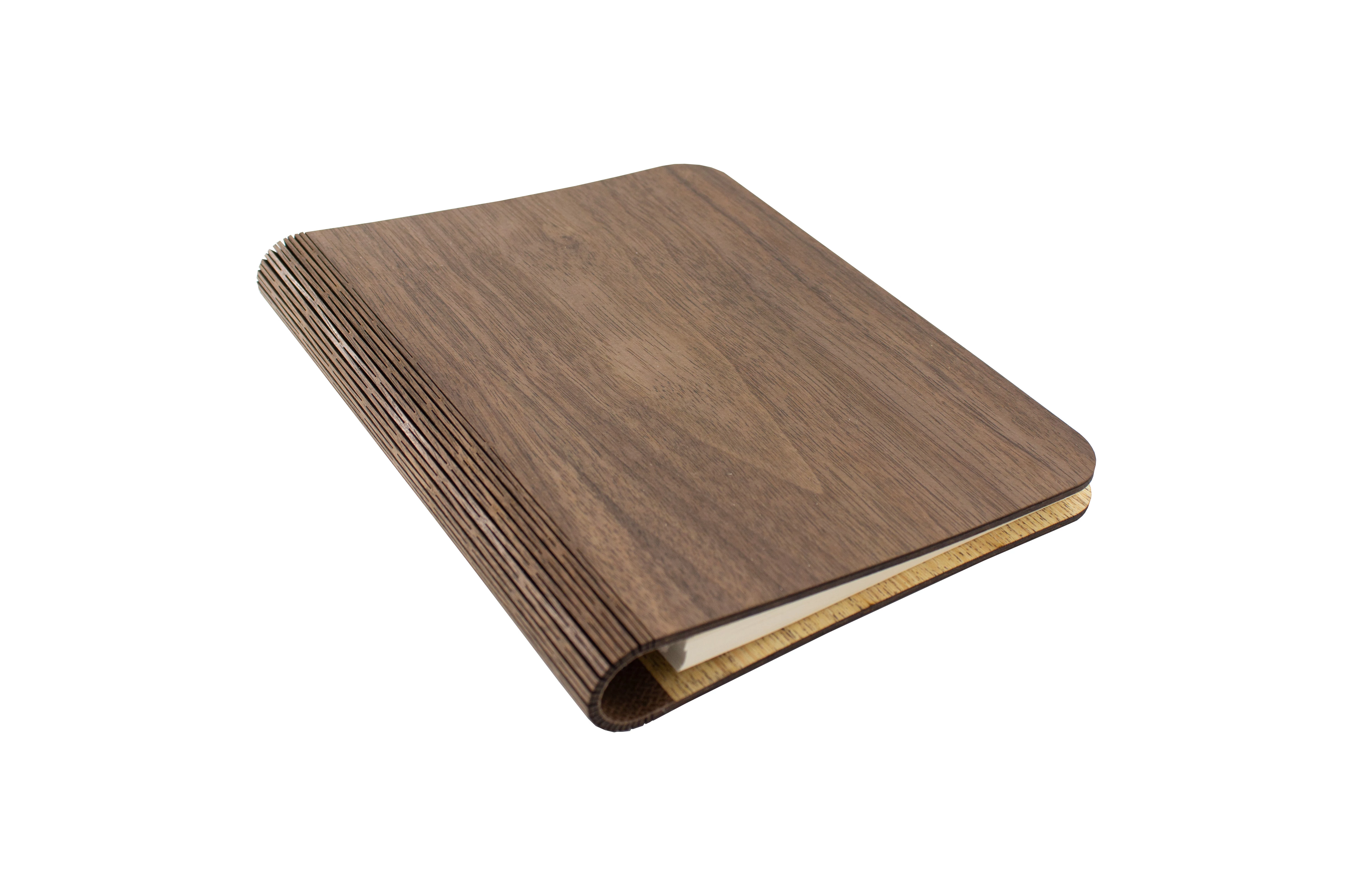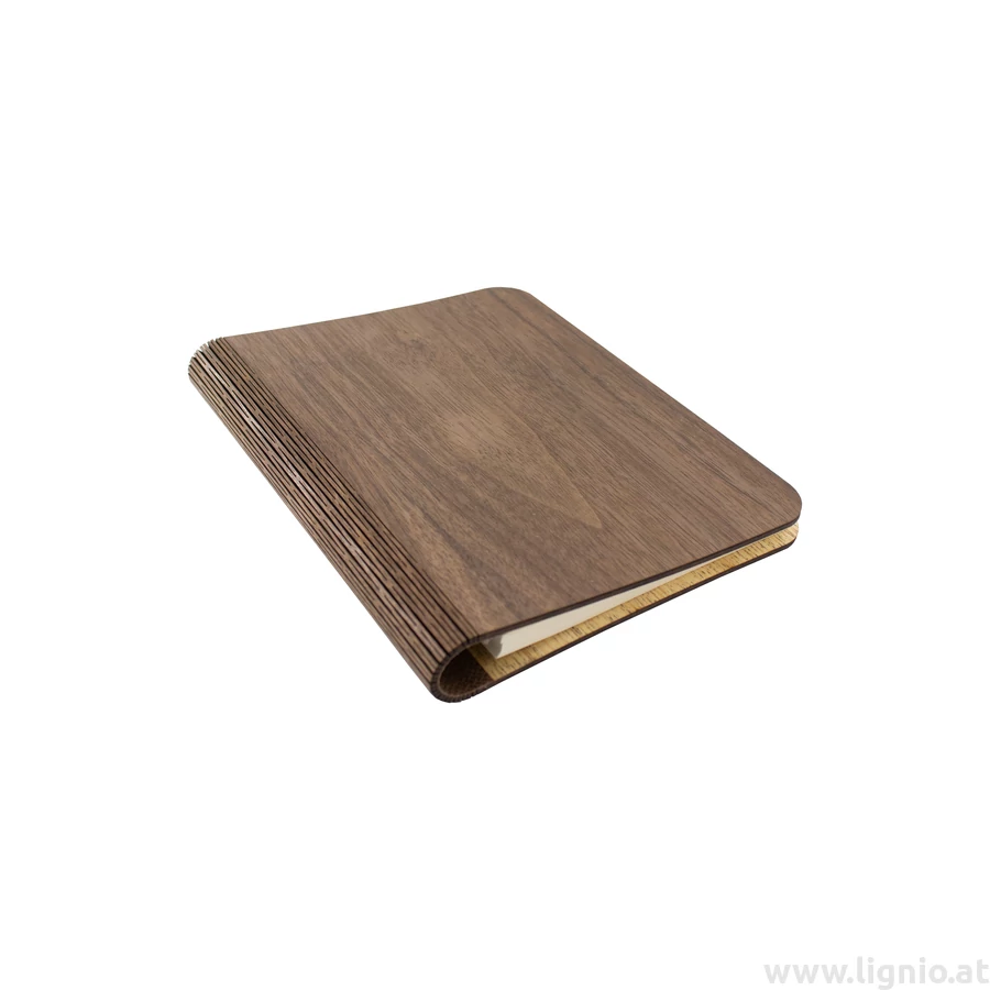 Notizbuch aus Nussholzfunier mit besonderen Lasercut an den Umschlag und auch an den Buchrücken was innen eine extra Befestigung hat. Das Holz ist mit natürlichem Öl veredelt. Die wechselbare füllung ist 80 g/m² FSC-zertifizierten Recyclingpapier in hochweiß. Echte Handarbeit. Maße: 22x17,7x3 cm, 3 Stück/Packung