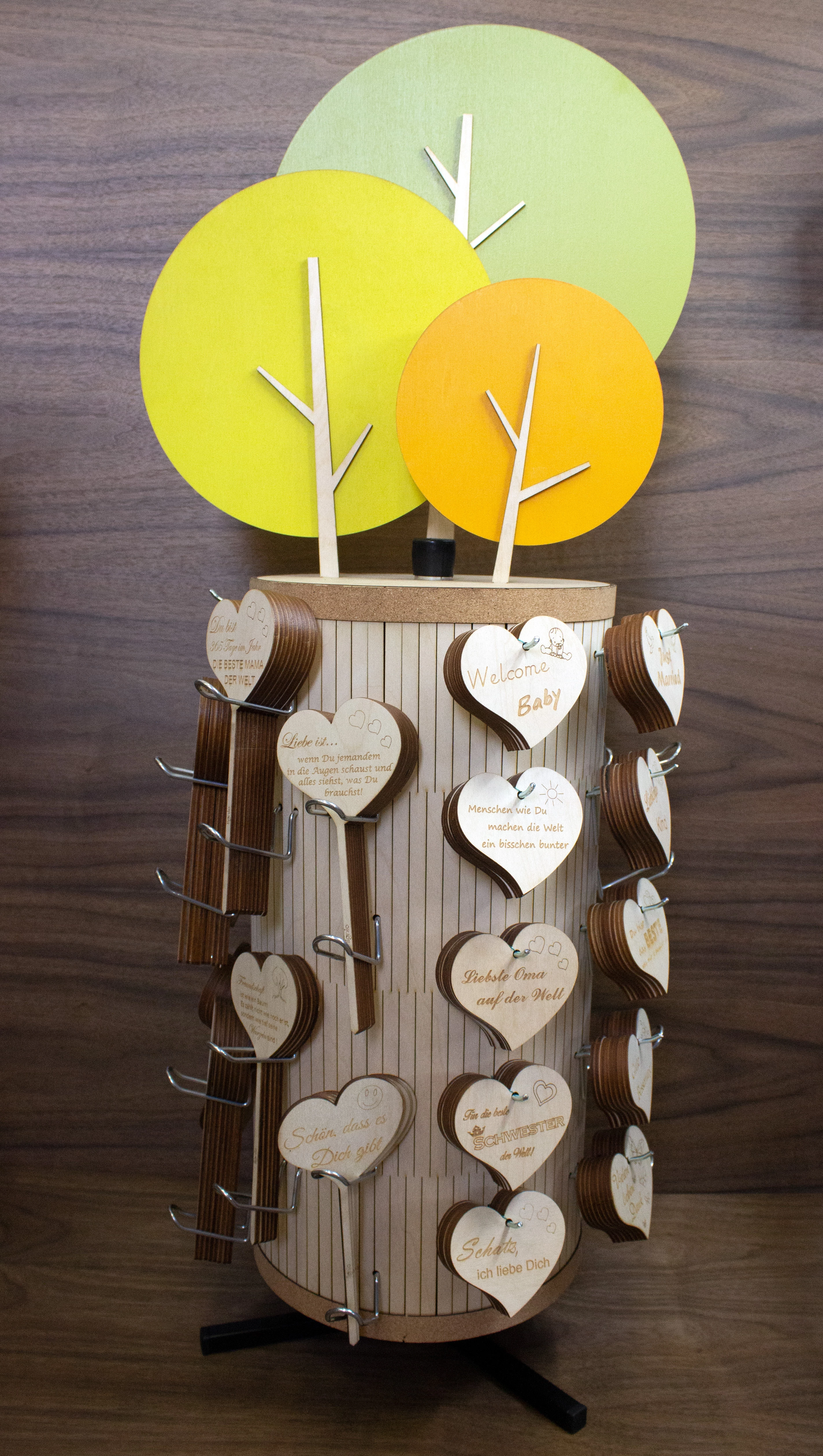 Display mit 160 Stück Natur Holzherz und 120 Stück herzförmigen Pflanzenstecker aus Birkenholz. Drehbar, Maße: 94,5x38 cm