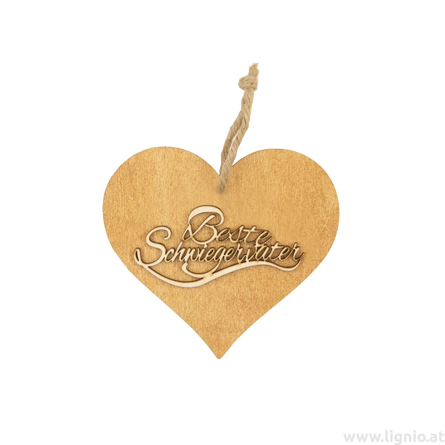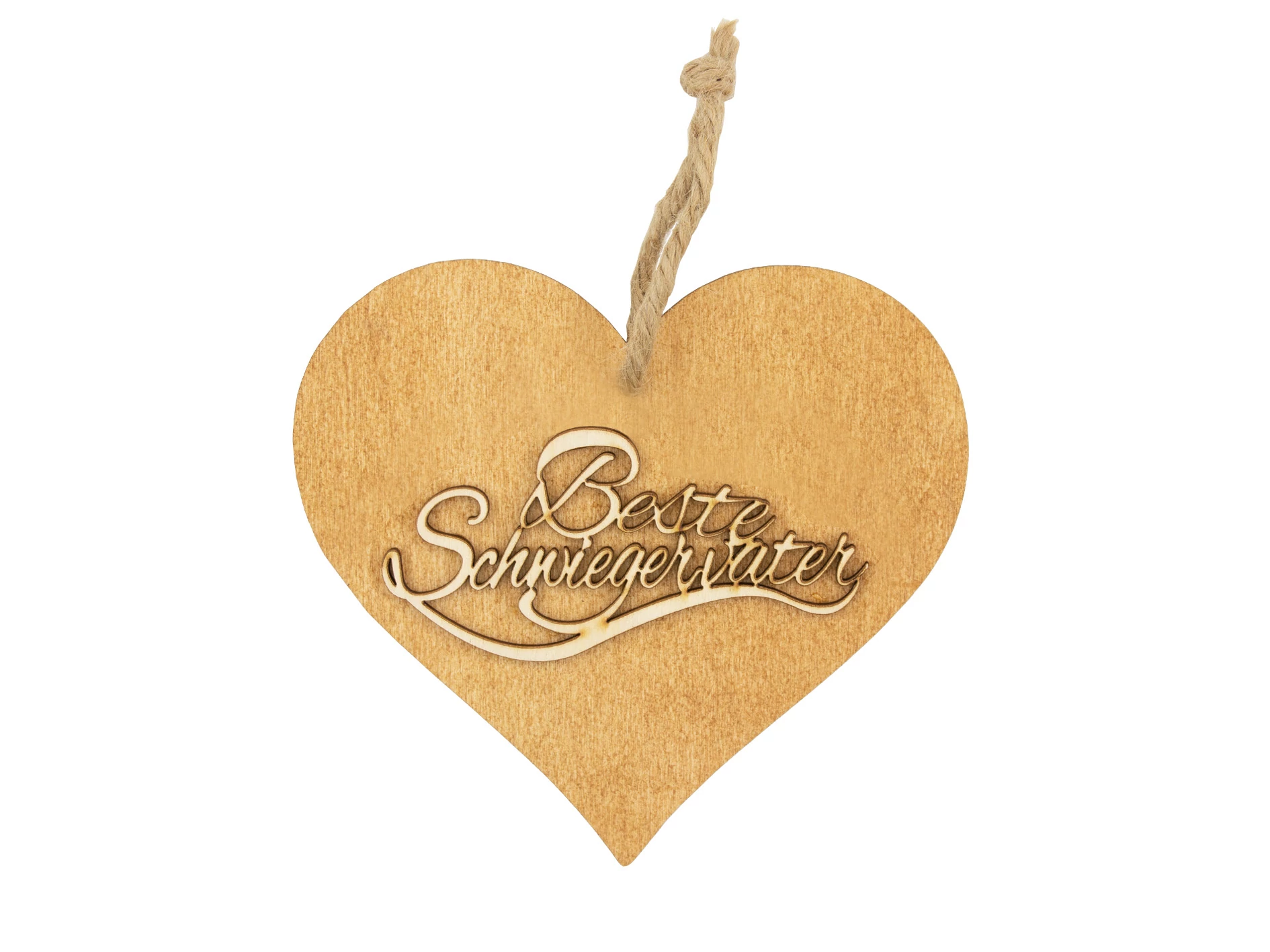 Braungebeiztes Holzherz mit Holzschriftzug an Jutegarn, Maße 18x17x0,3 cm, aus Birkenholz. 7 Stk./Packung