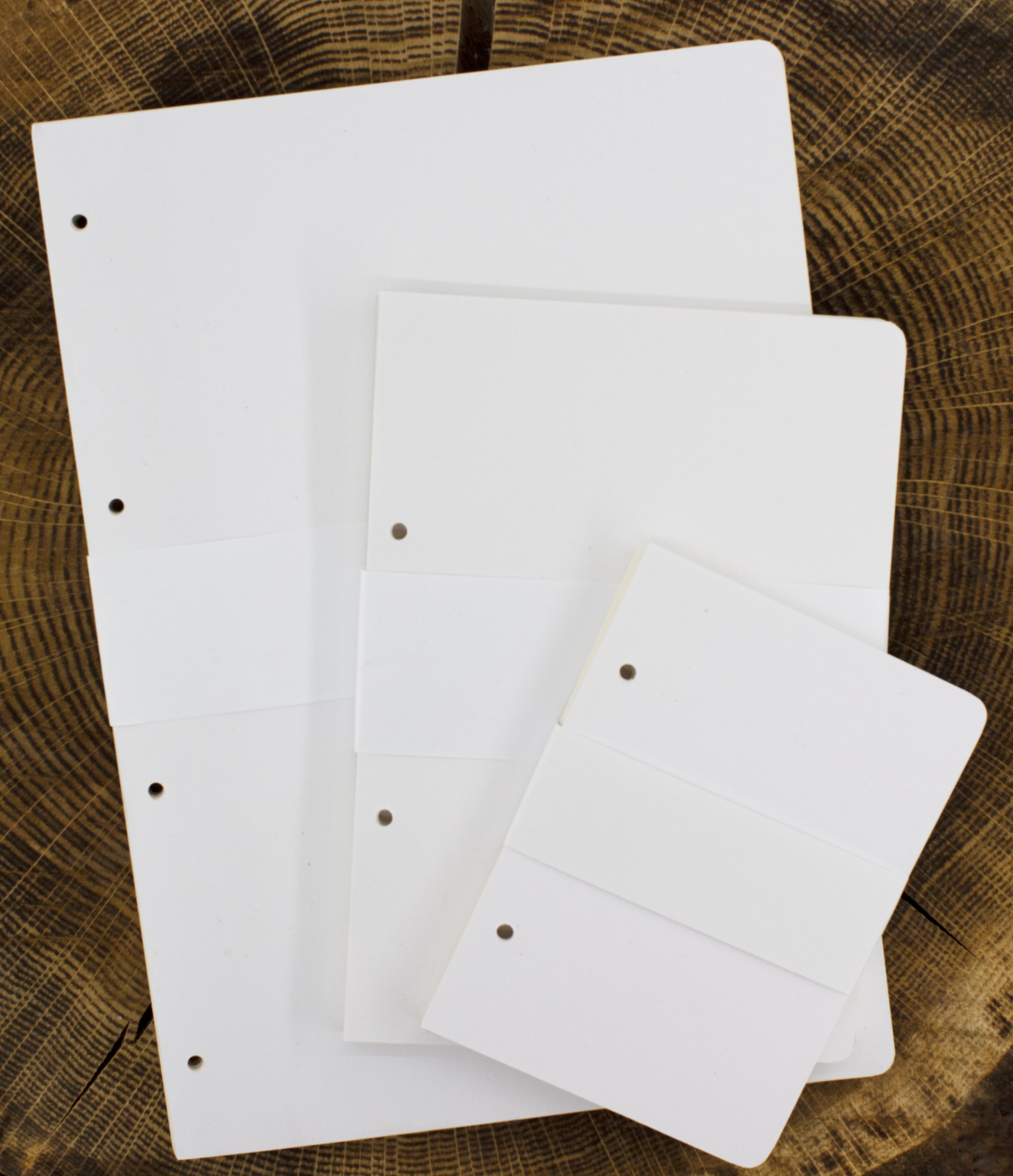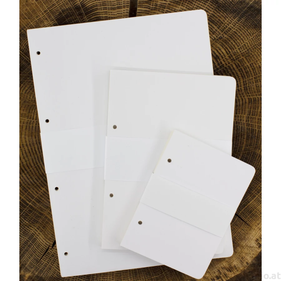 Wechselbare Bucheinlage für A5 Holzbücher aus Recyclingpapier in hochweiß. 3x50 Blatt/Packung