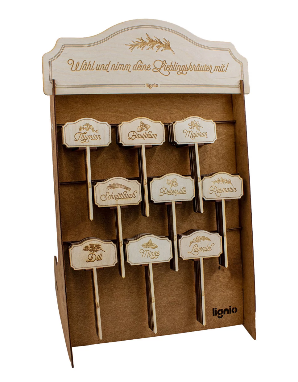 Dispaly mit 90 Stück eckigen Kräuterstecker, enthält: Thymian, Basilikum, Majoran, Schnittlauch, Petersilie, Rosmarin, Dill, Minze, Lavendel.