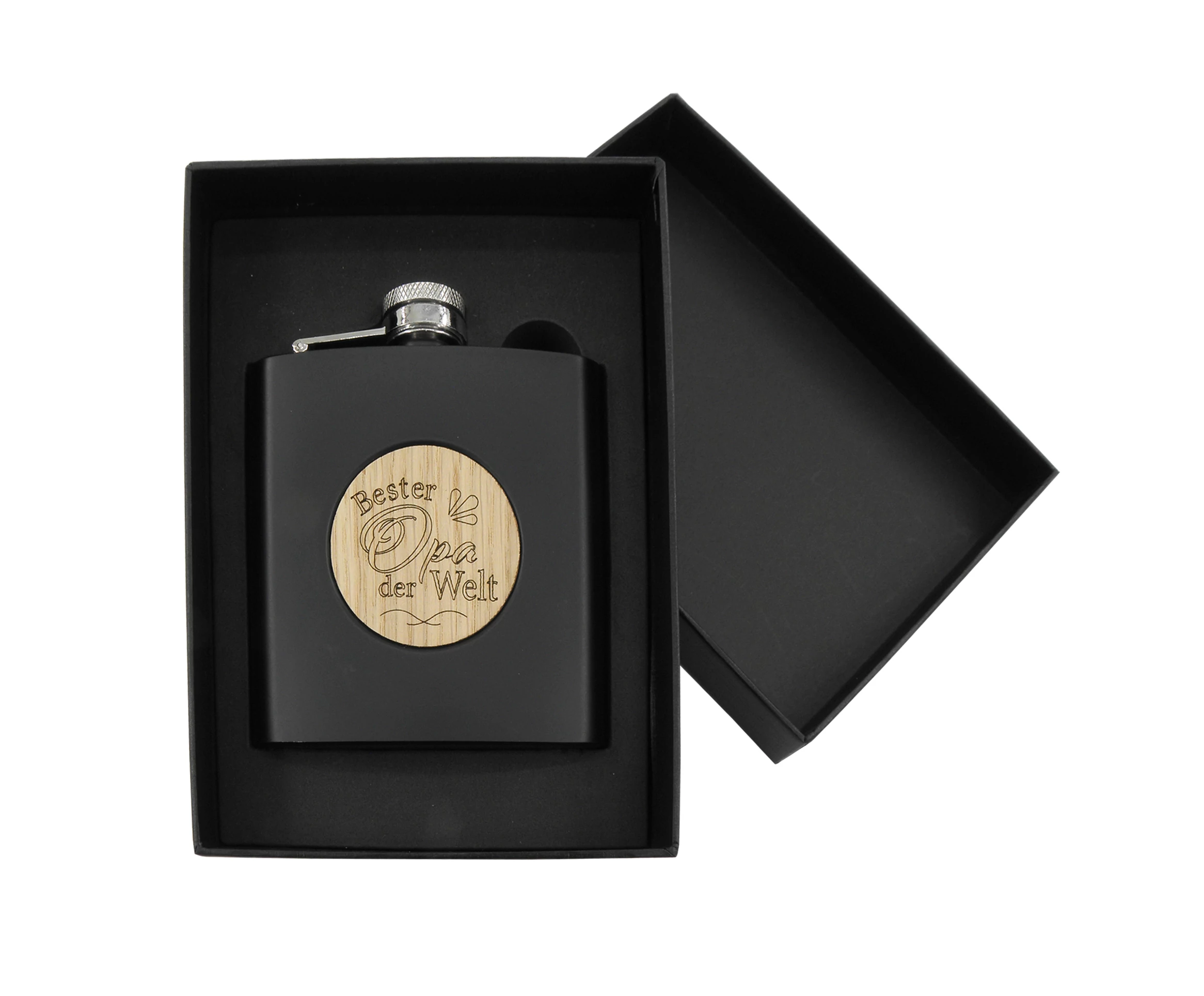 Schwarze Metallflasche mit Schrift in Geschenkbox. Maße: 11x9 cm