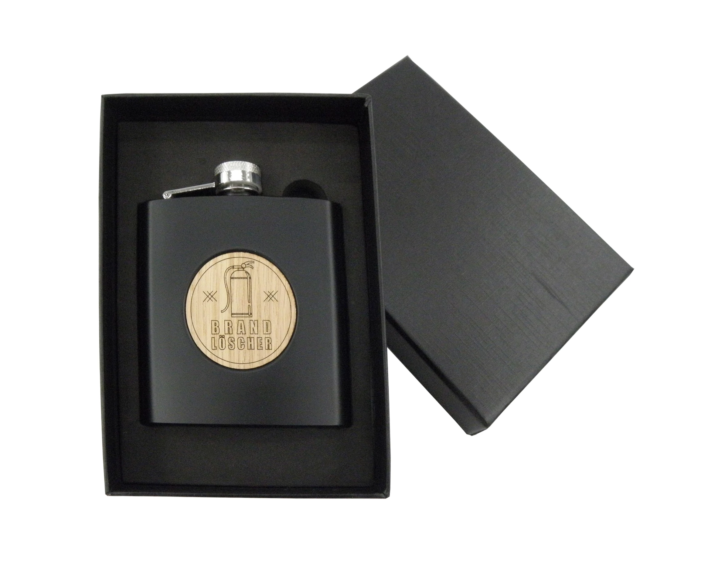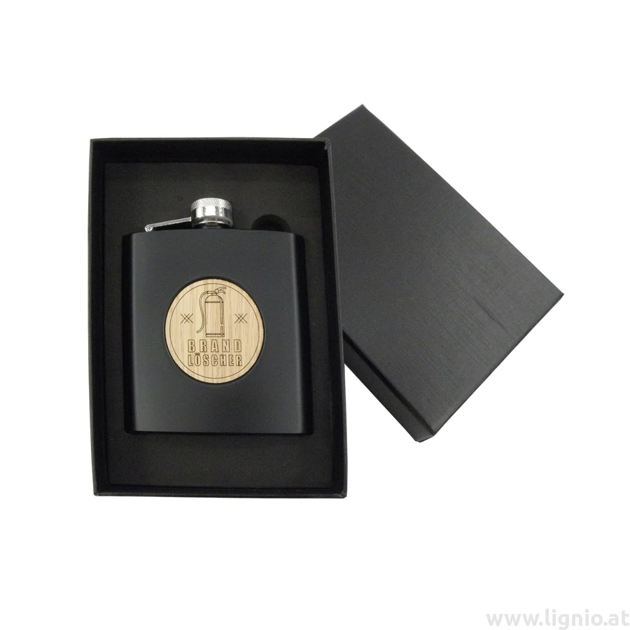 Schwarze Metallflasche mit Schrift in Geschenkbox. Maße: 11x9 cm