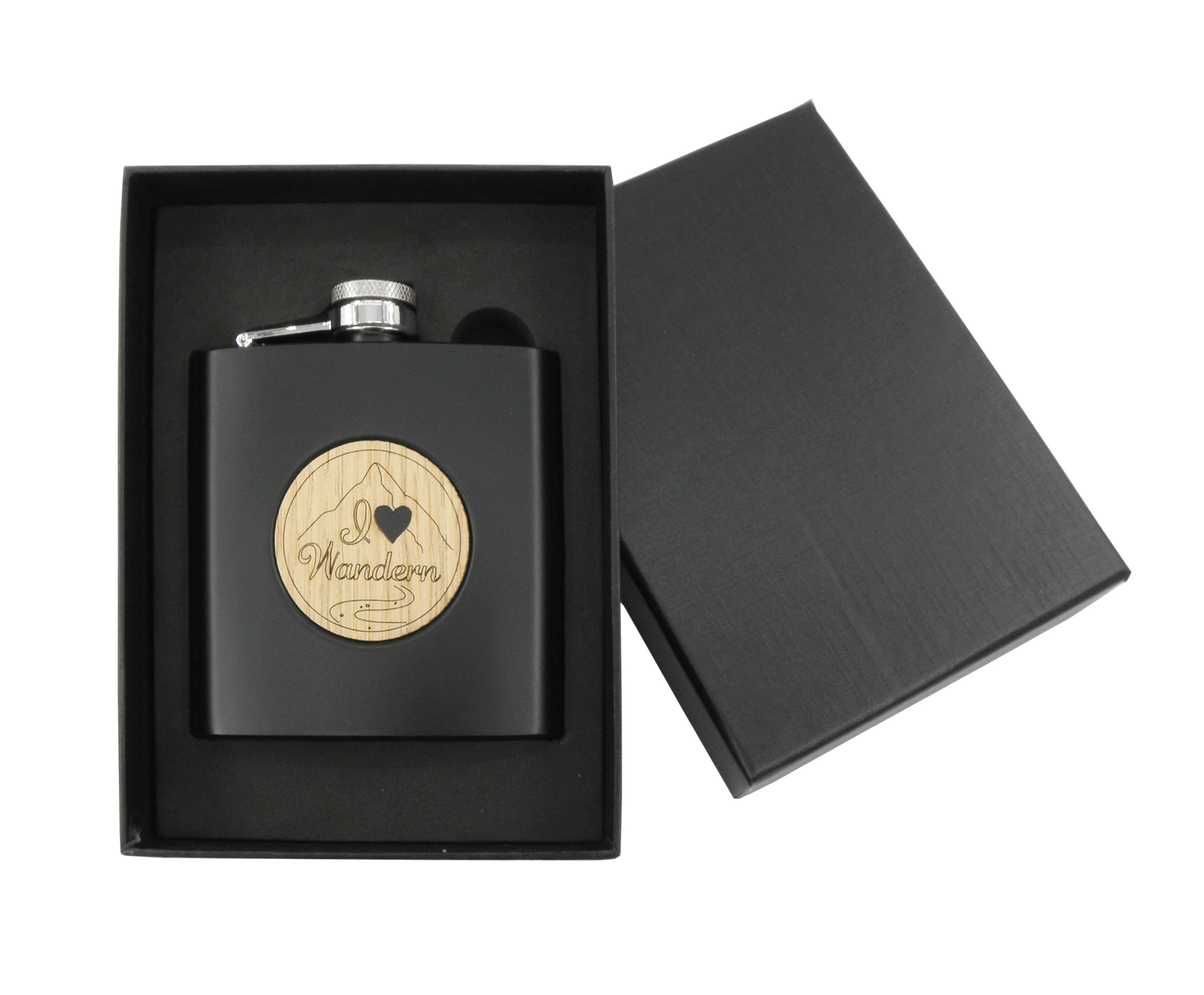 Schwarze Metallflasche mit Schrift in Geschenkbox. Maße: 11x9 cm