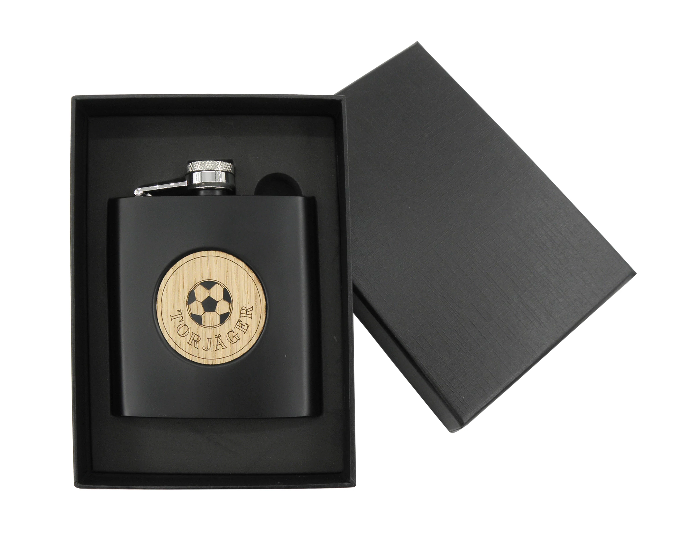 Schwarze Metallflasche mit Schrift in Geschenkbox. Maße: 11x9 cm