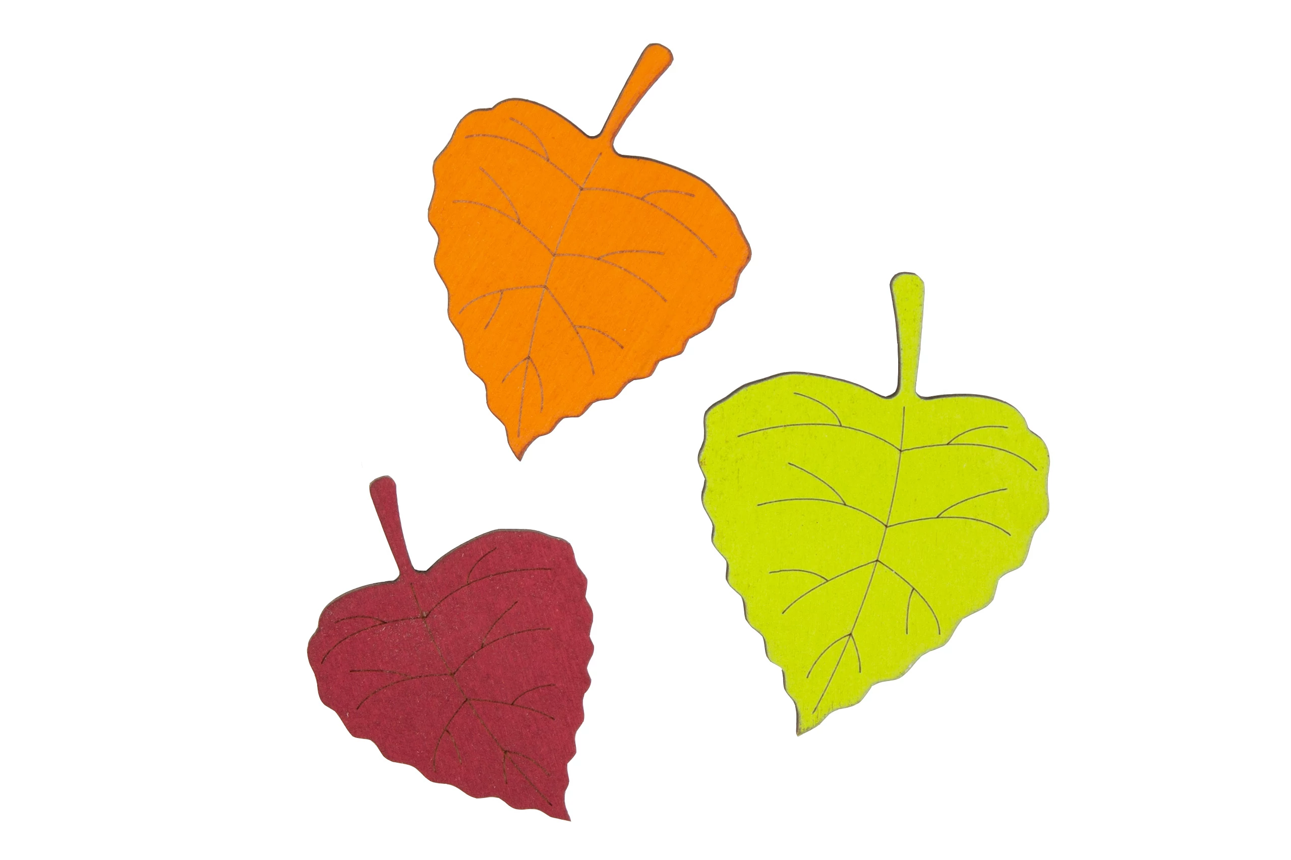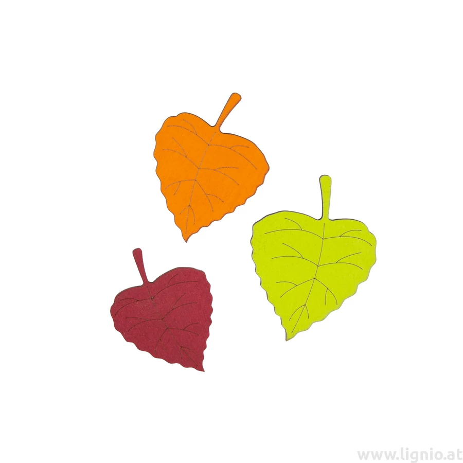 Holzigure aus Birkenholz, rot, orange und gün mix. Maße: 6,5x4,9x0,3 cm, 6x4,4x0,3 cm und 5,4x4x0,3 cm, 30 Stück/Packung
