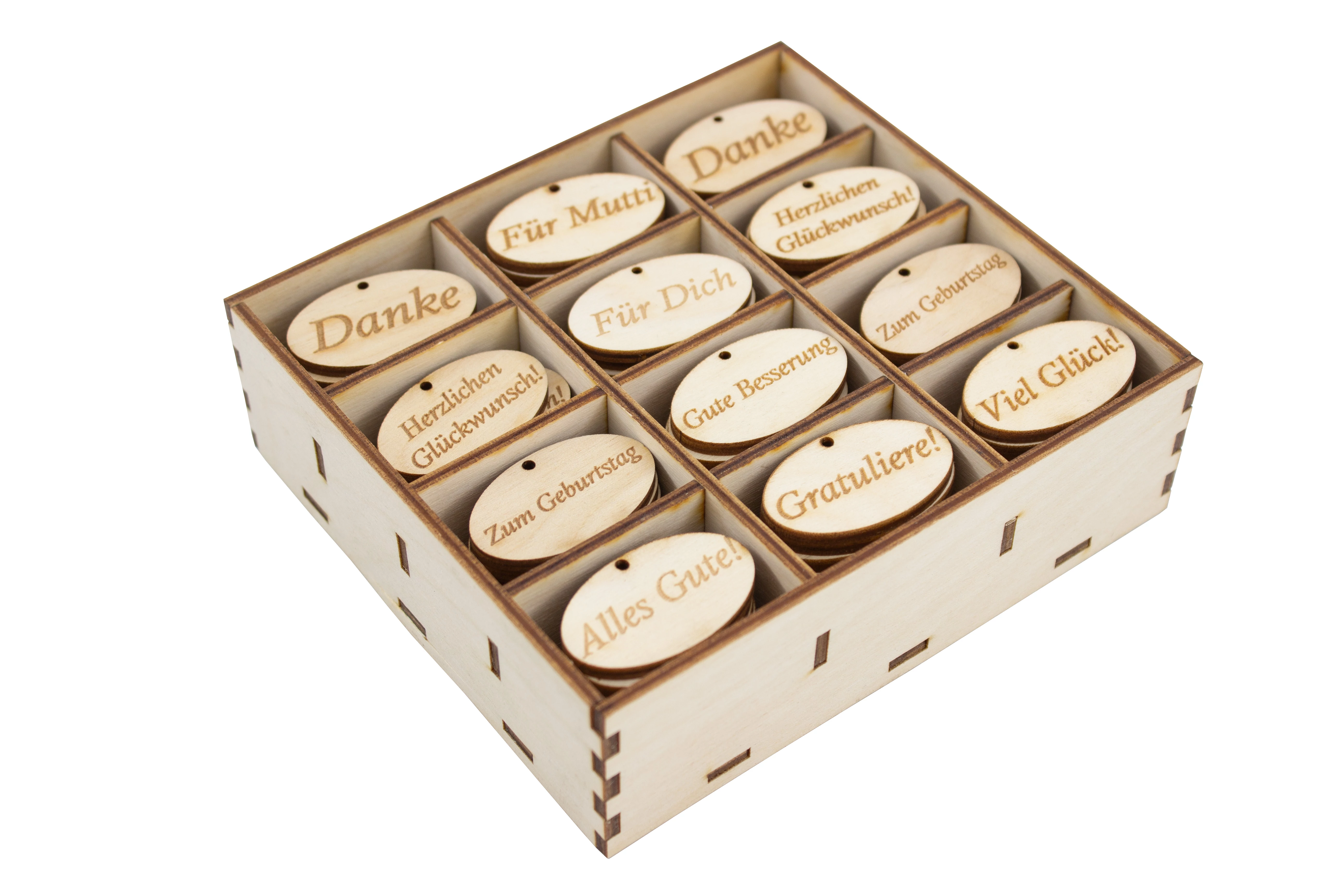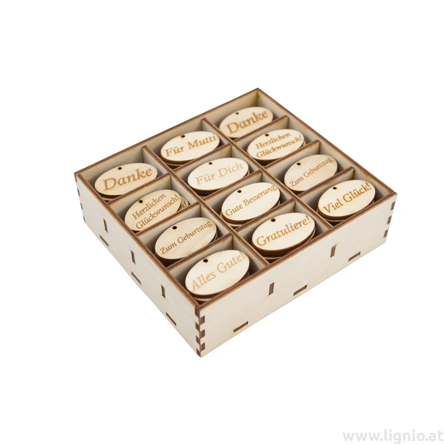 120 Stück kleinen Tafeln aus Birkenholz in Holzbox, enthält: "Danke" - 20 Stück, "Für Mutti" - 10 Stück, "Herzlichen Glückwunsch" - 20 Stück, "Für Dich" - 10 Stück, "Zum Geburtstag" - 20 Stück, "Gute Besserung" - 10 Stück, "Alles Gute" - 10 Stück, "Gratuliere" - 10 Stück, "Viel Glück" - 10 Stück. Tafelchen Größe: 2,5x4x0,3 cm
