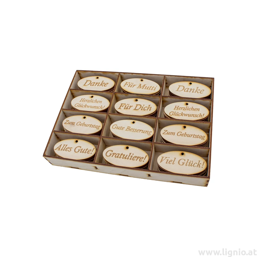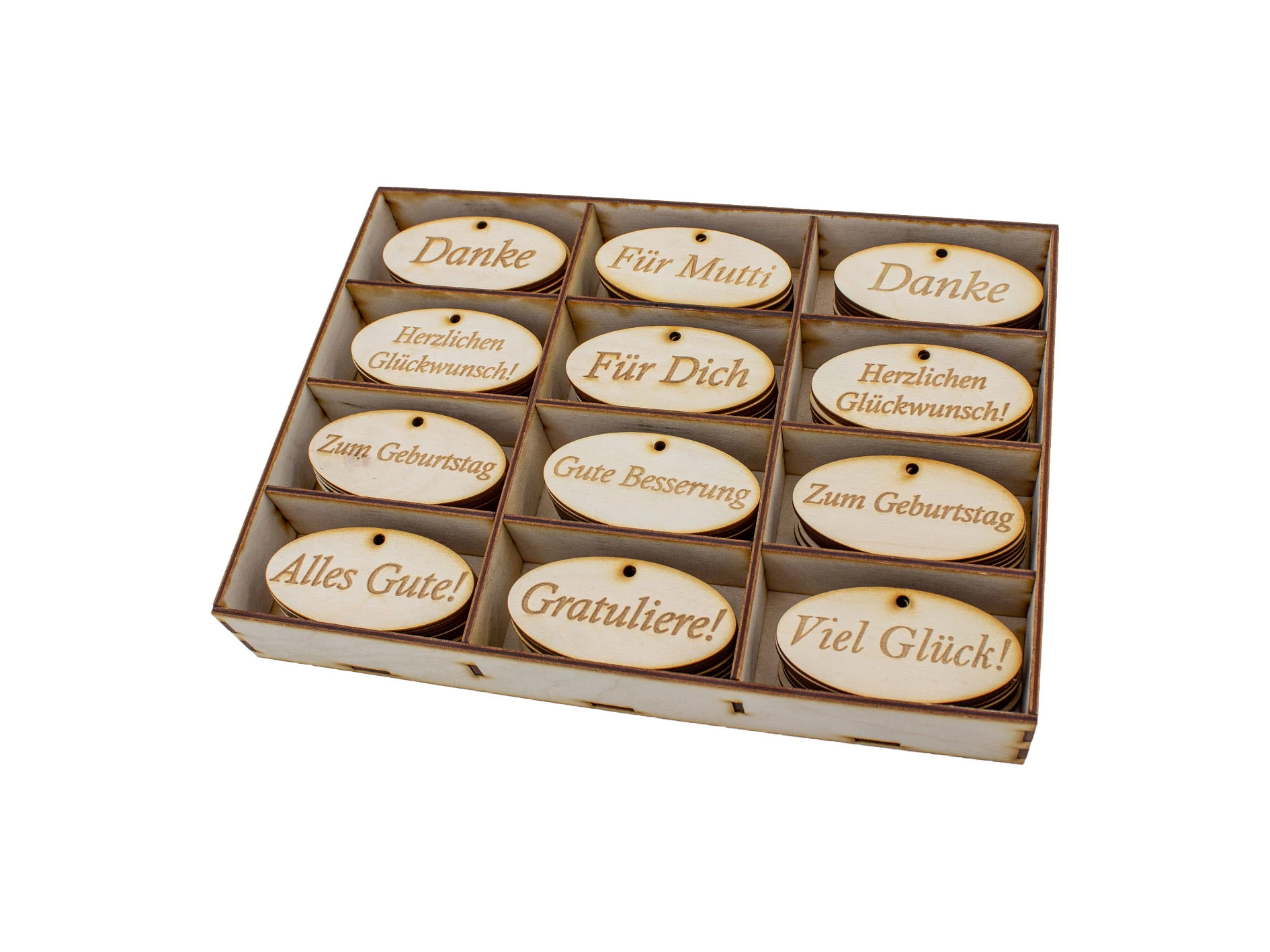 120 Stück kleinen Tafeln aus Birkenholz in Holzbox, enthält: "Danke" - 20 Stück, "Für Mutti" - 10 Stück, "Herzlichen Glückwunsch" - 20 Stück, "Für Dich" - 10 Stück, "Zum Geburtstag" - 20 Stück, "Gute Besserung" - 10 Stück, "Alles Gute" - 10 Stück, "Gratuliere" - 10 Stück, "Viel Glück" - 10 Stück. Tafelchen Größe: 4,2x8x0,3cm