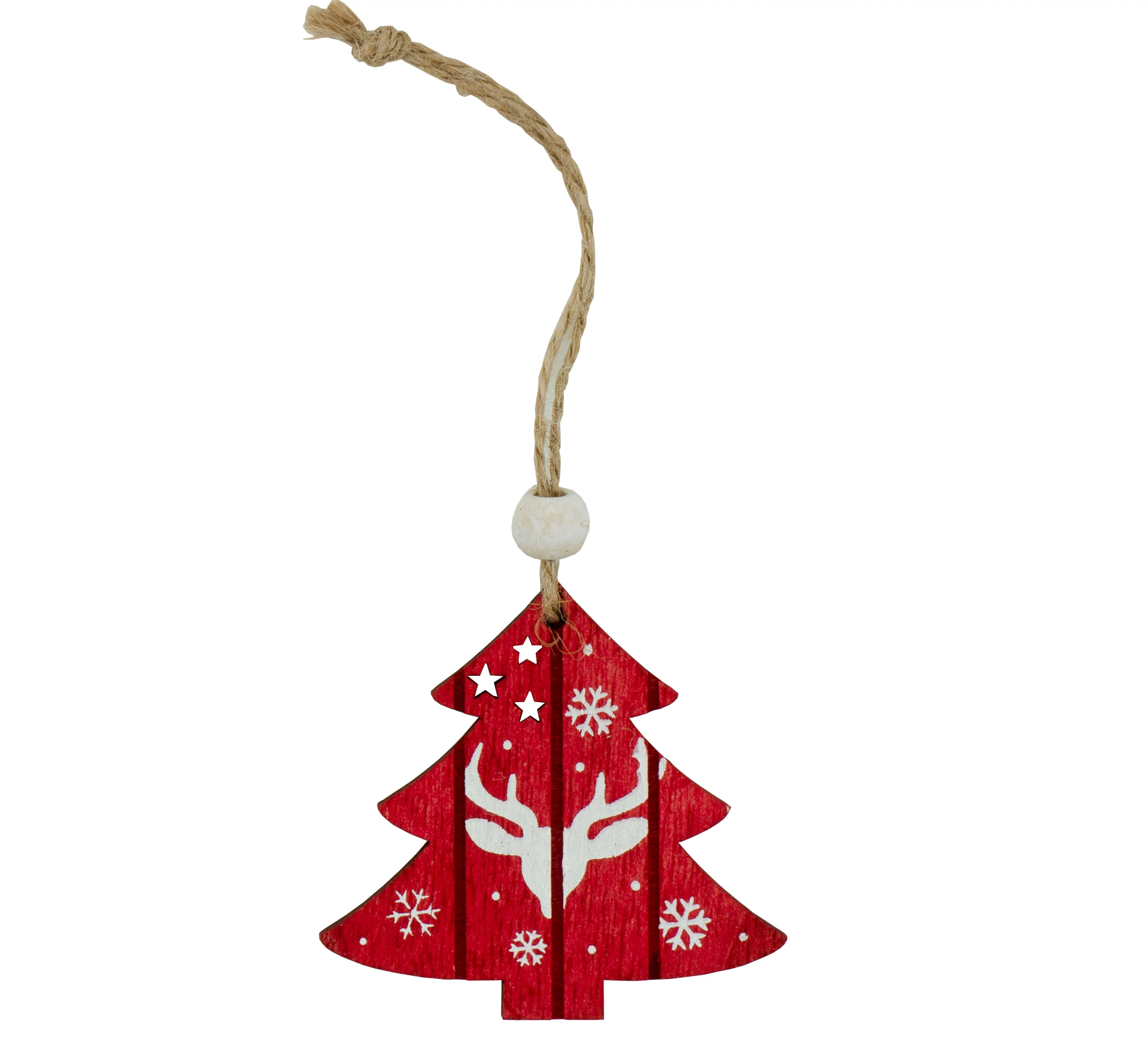 Holz Weihnachtsbaum rot und weiß gemalt an Jutegarn, Maße: 6x6,3x0,3 cm, 14 Stück/Packung