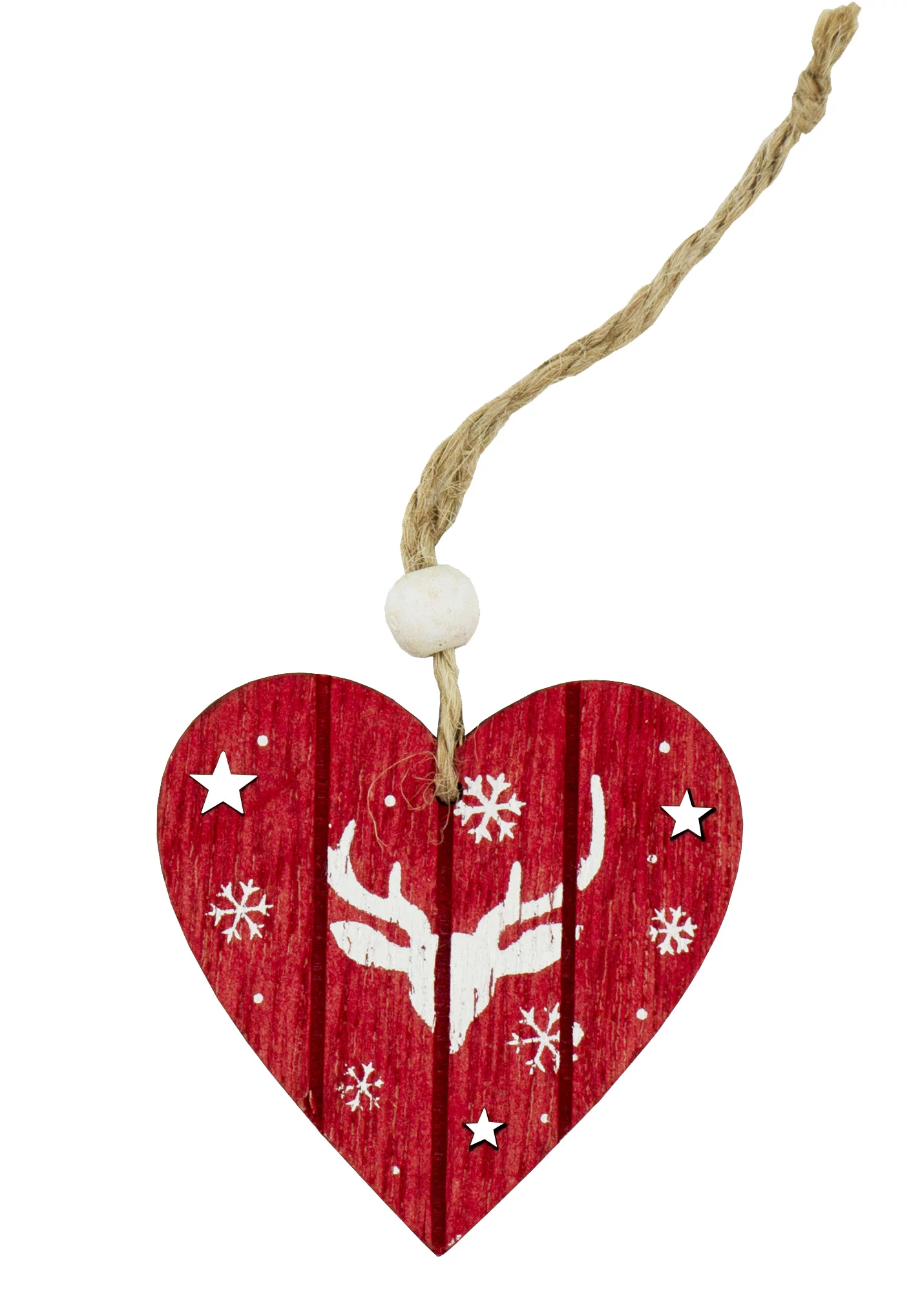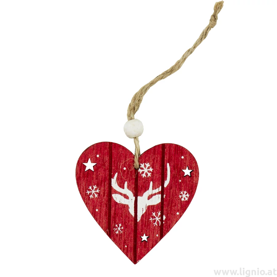 Holz Herz rot und weiß gemalt an Jutegarn, Maße: 6,2x6,2x0,3 cm, 14 Stück/Packung